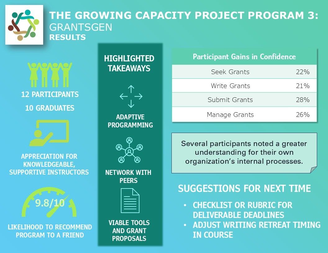 Those early conversations inspired the larger GCP initiative—leading to Programs 1 and 2—and eventually came full circle with Program 3: GrantsGen, the capstone mentoring and training experience focused on advancing fundraising capacity through hands-on grant mentorship.If you are new to learning about the Growing Capacity Project (GCP), please read this project overview before continuing.